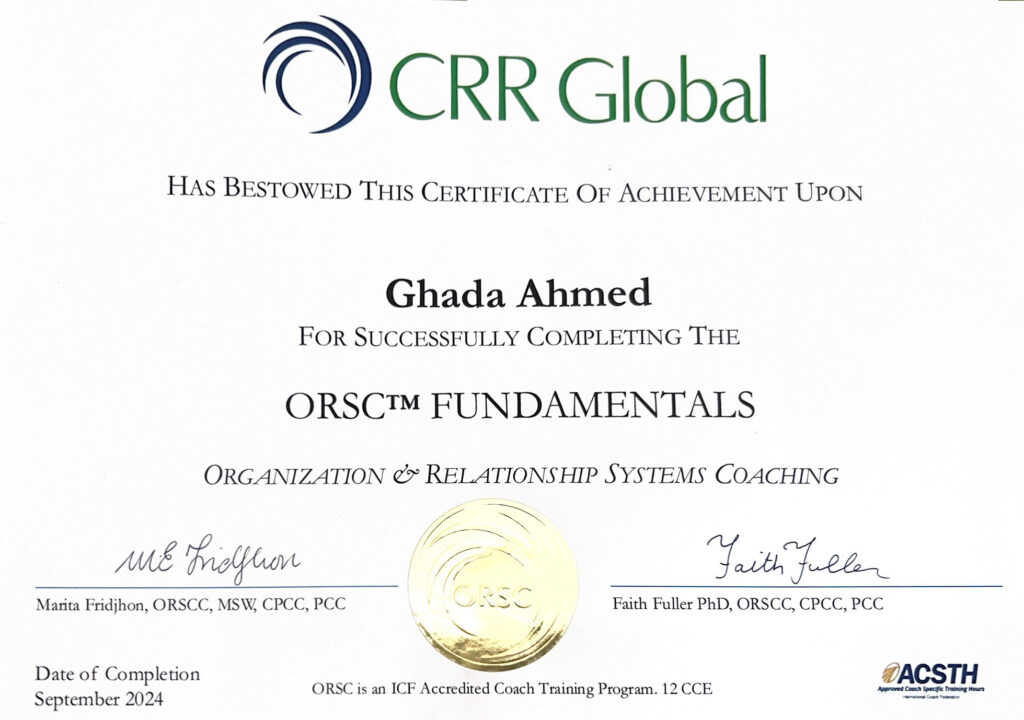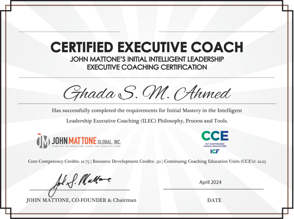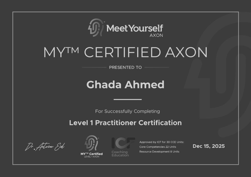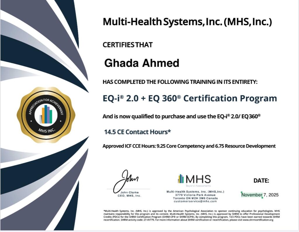 As an ICF Professional Certified Coach (PCC), Associate CIPD (Level 5), and MBA graduate in Strategic Management from MSM, Netherlands, she blends global coaching standards with practical, real-world leadership expertise. Ghada is also a certified EQ-i 2.0 and EQ 360 Assessor by MHS Inc.,, Initial Intelligent Leadership Executive Coach (trained by John Mattone), Enneagram Personal Analyst, and a Meet Yourself Facilitator trained, UK —enabling her to guide clients through powerful self-awareness and emotional intelligence work.